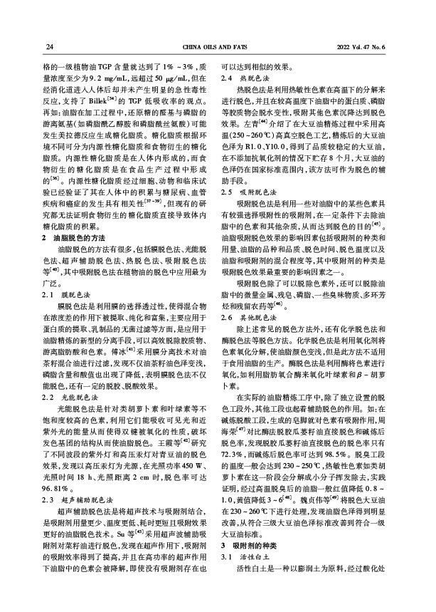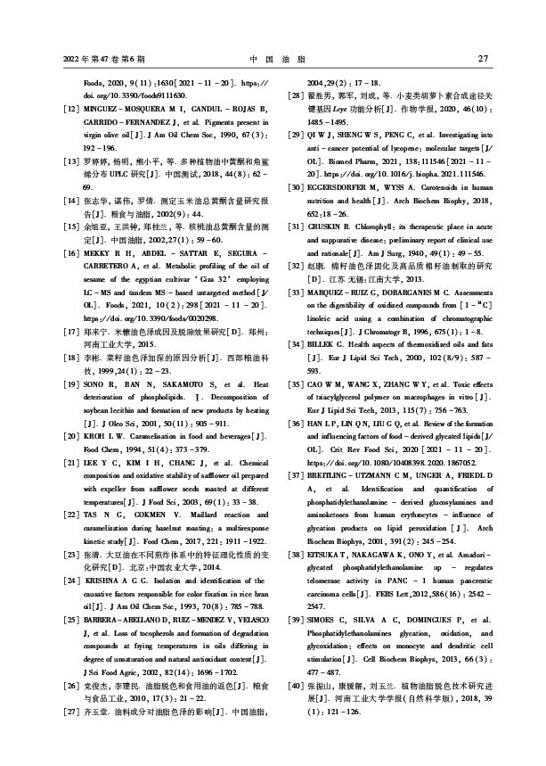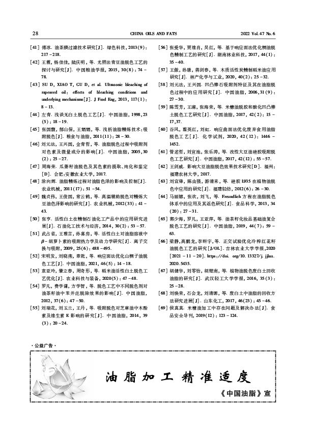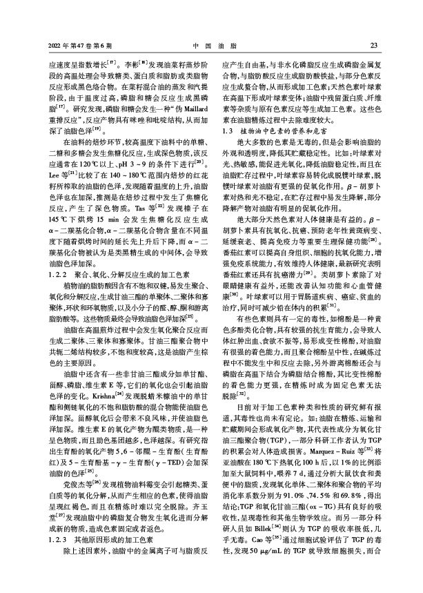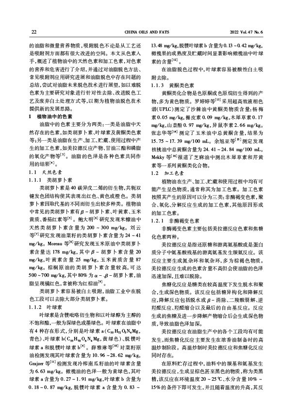 三、转载:中国油脂2022年第47卷第6期-油脂加工-植物油中的色素及吸附脱色研究进展